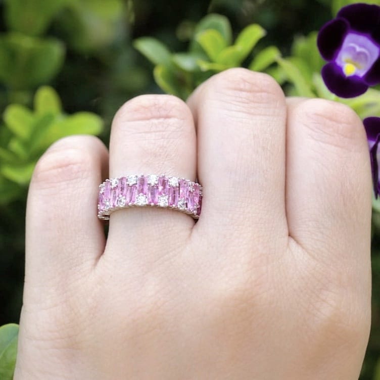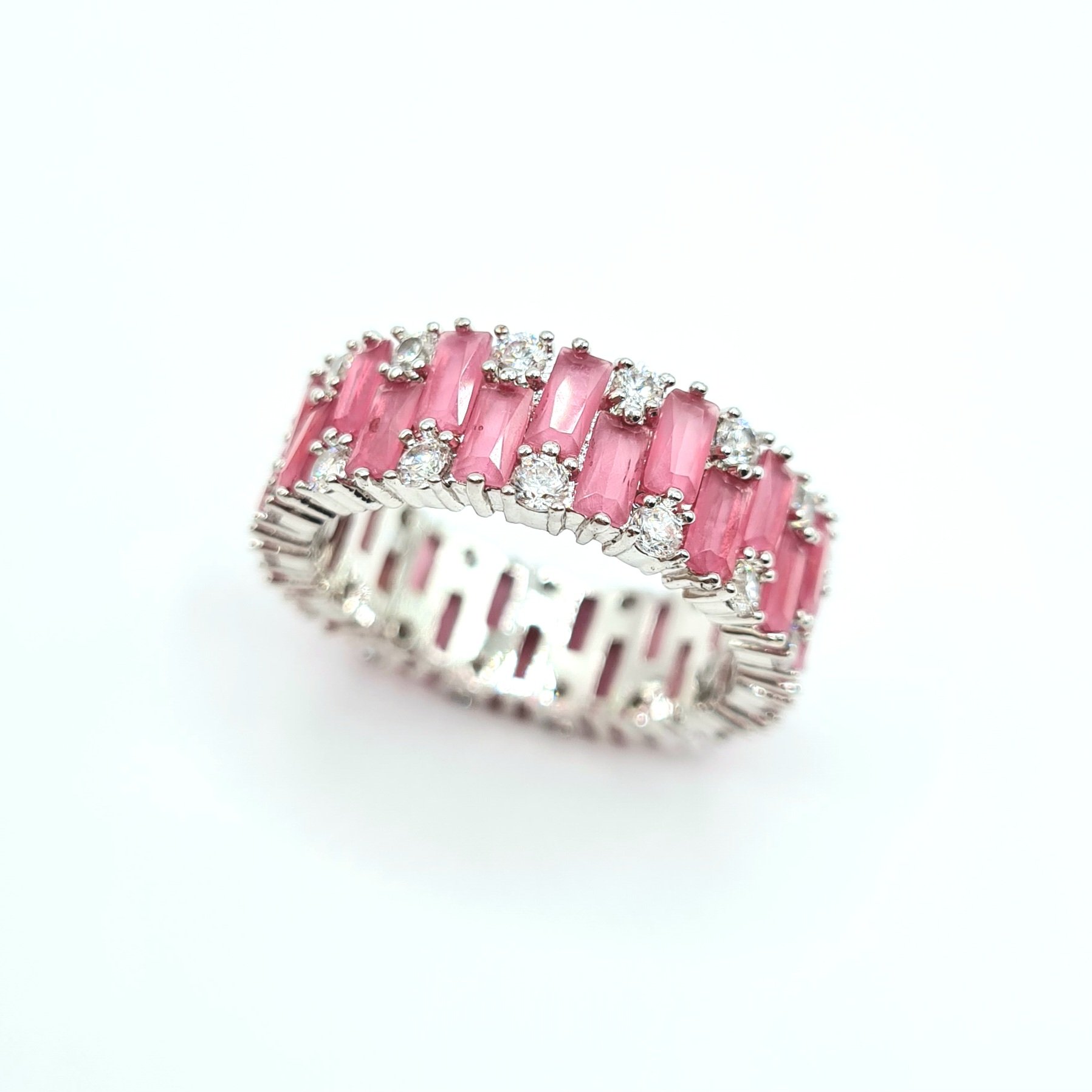 Banho de ródio branco, zircônias baguete rosa claro e pequenas zircônias brancas nas laterais